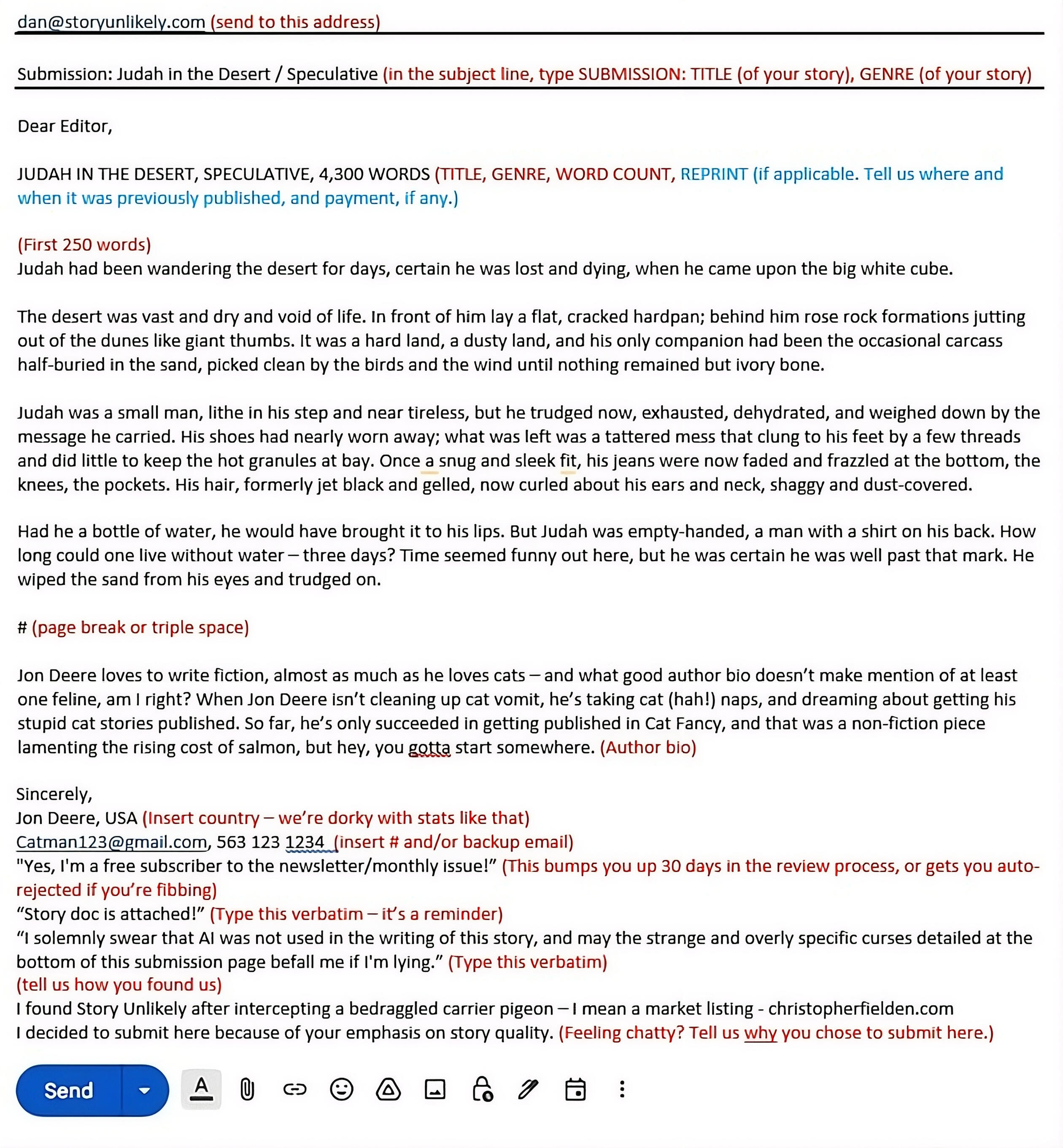 -FORMATTING – Follow our sample above. We’re not concerned with manuscript formatting as long as it’s not obnoxious.