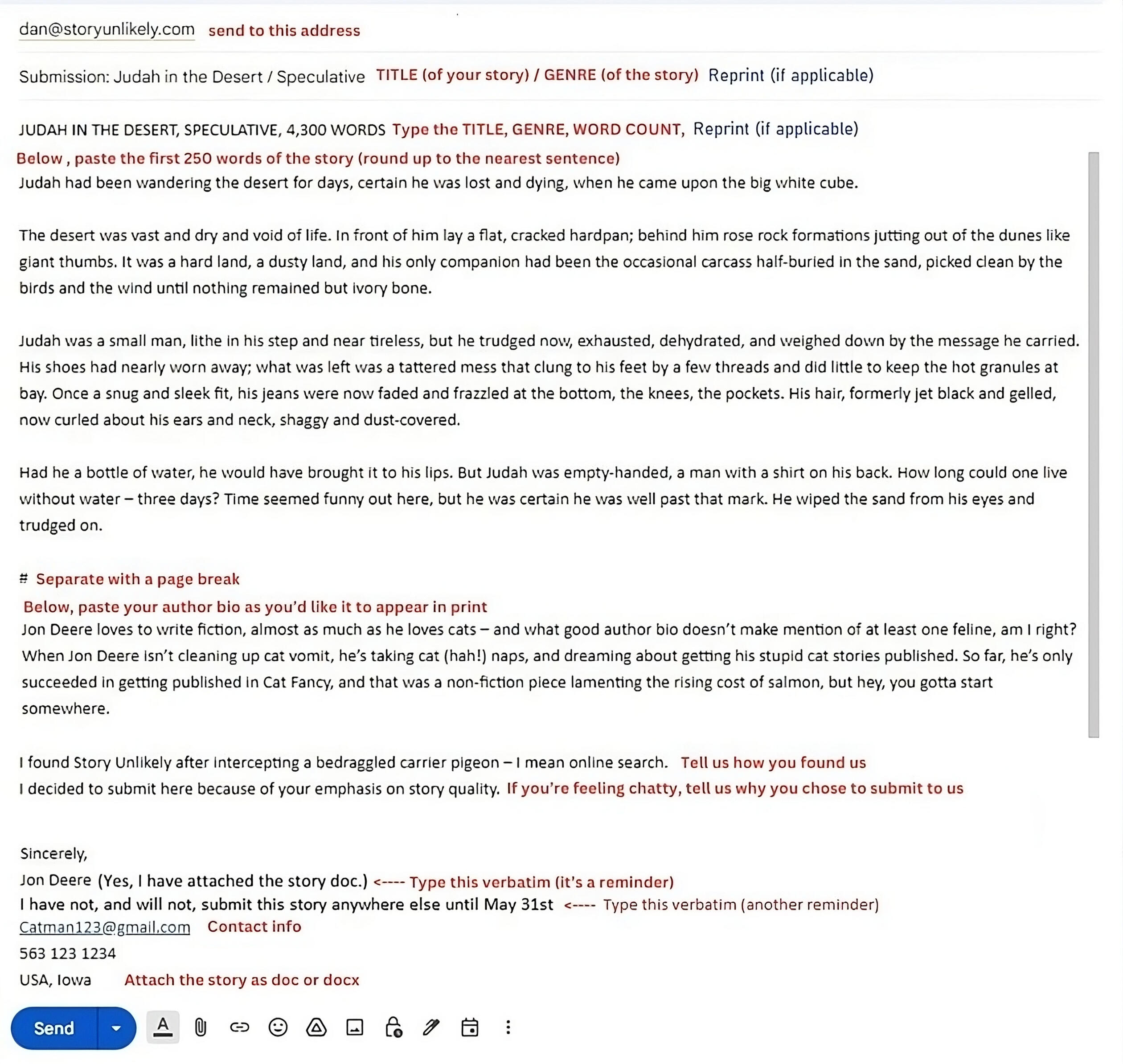 Formatting issues:1. I can’t make a ‘page break’ in my email:Don’t sweat it. Just double space or do something to separate the sections.2. I don’t know what to put in my author bio:Don’t sweat it. Do the best you can. These get finalized after we accept your story.3. I can’t attach a doc or docx. Can I use something else?We have a variety of readers reading submissions from a variety of devices, so please save us the hassle and follow this request. If you must, you can use something else like RTF, but know that if we can't read your submission, then you risk it getting tossed.
